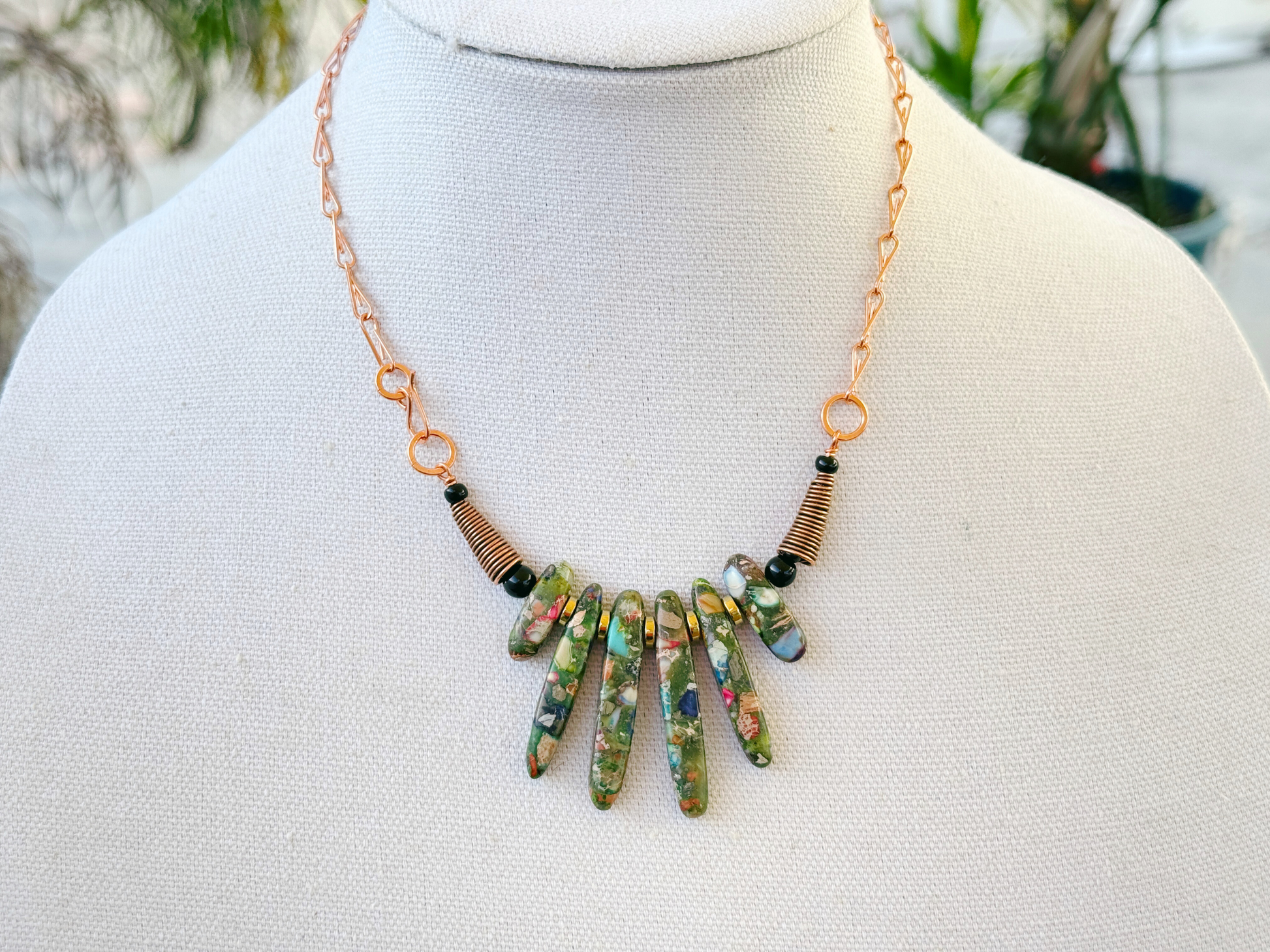 Vibrant and eclectic, this composite mosaic stone necklace displays a radiant fan of multicolored jasper spikes—each with a unique mix of stone textures and tones. Anchored by a handmade sculptural copper chain, this playful yet refined stone spike bib is a statement necklace that adds color and character to any collection.