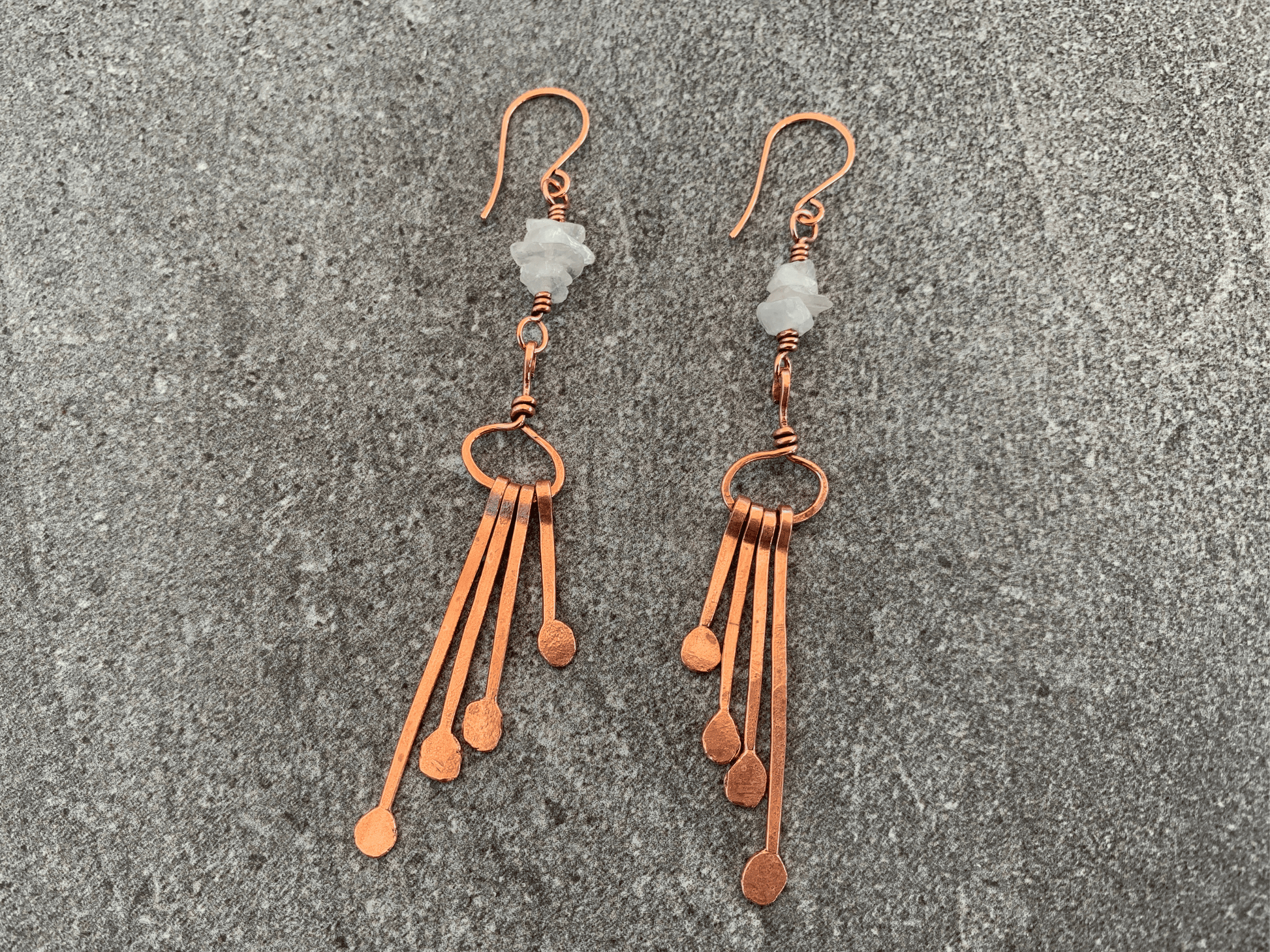 Lightweight and full of motion, these hammered copper earrings are anchored by soft pink rose quartz chips and finished with hammered fringe drops. The raw stone adds a delicate contrast to the warm copper, offering a sun-kissed glow that feels both grounded and light.